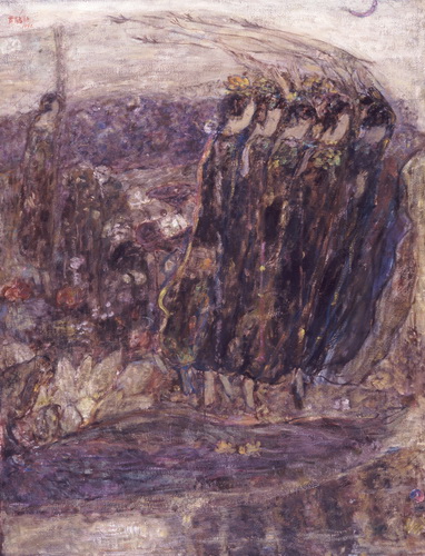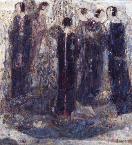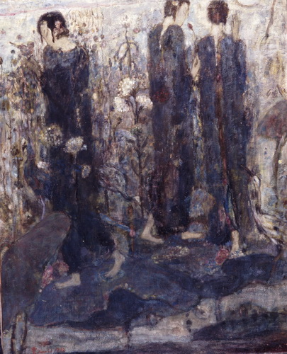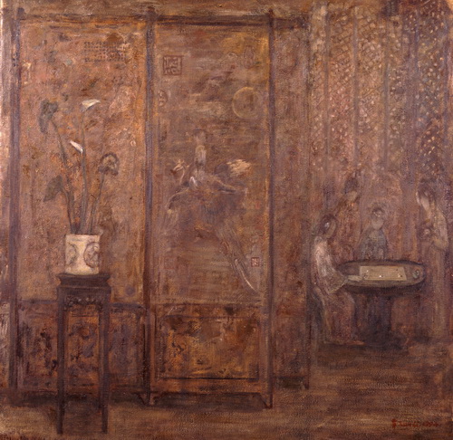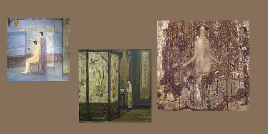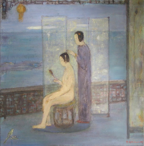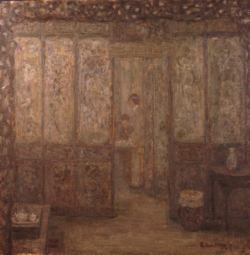 一个个的人物,串成了梦,她们的一举一动是一个谜。那是一个让画家心动的女性世界,它是传统的,也是历史的,这个世界在宽敞的宫殿里,在狭小的闺房里,在鸟语花香之间,在绿树庭院里。然而,在如此安详的氛围中,显露出一丝肃穆和庄重,这体现了一个时代的精神。诚然,这并不微不足道,因为它正是直觉感知的形成和发展的主心轴。但是,如果呈现的对象与时俱进,呼应了天鹅绒般的柔软和黯淡柔和的灰色,那么,表现其的技法则首先是非常现代的油画,明暗的分布,可呼吸的空间,细腻的单色纹理布置,这些让我们想起厄利·弗尔曾经所说的: 质是整个绘画的精神。于是,情感,我们无须去寻找,它应时而生,就如同波纳尔所说的: ‘‘碰撞是一瞬间的,通常无法预料。’’